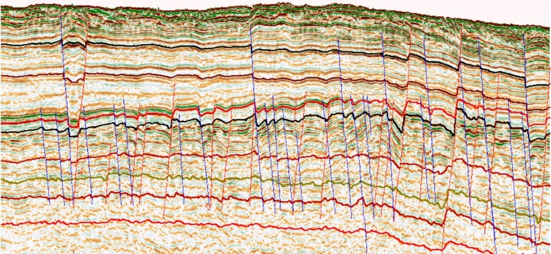 Пример вертикального сечения куба амплитуд с наложением результатов корреляции отражающих горизонтов и трассирования тектонических нарушений